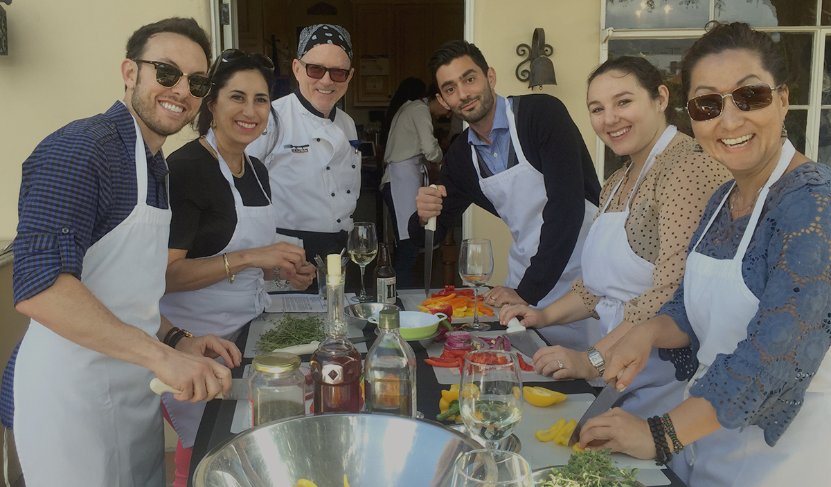 Corporate groups and private parties participating in our hands-on cooking events enjoy a welcome reception before dividing into smaller groups to cook and play in the kitchen. Each group creates a different portion of the meal under the guidance of our chef instructors.